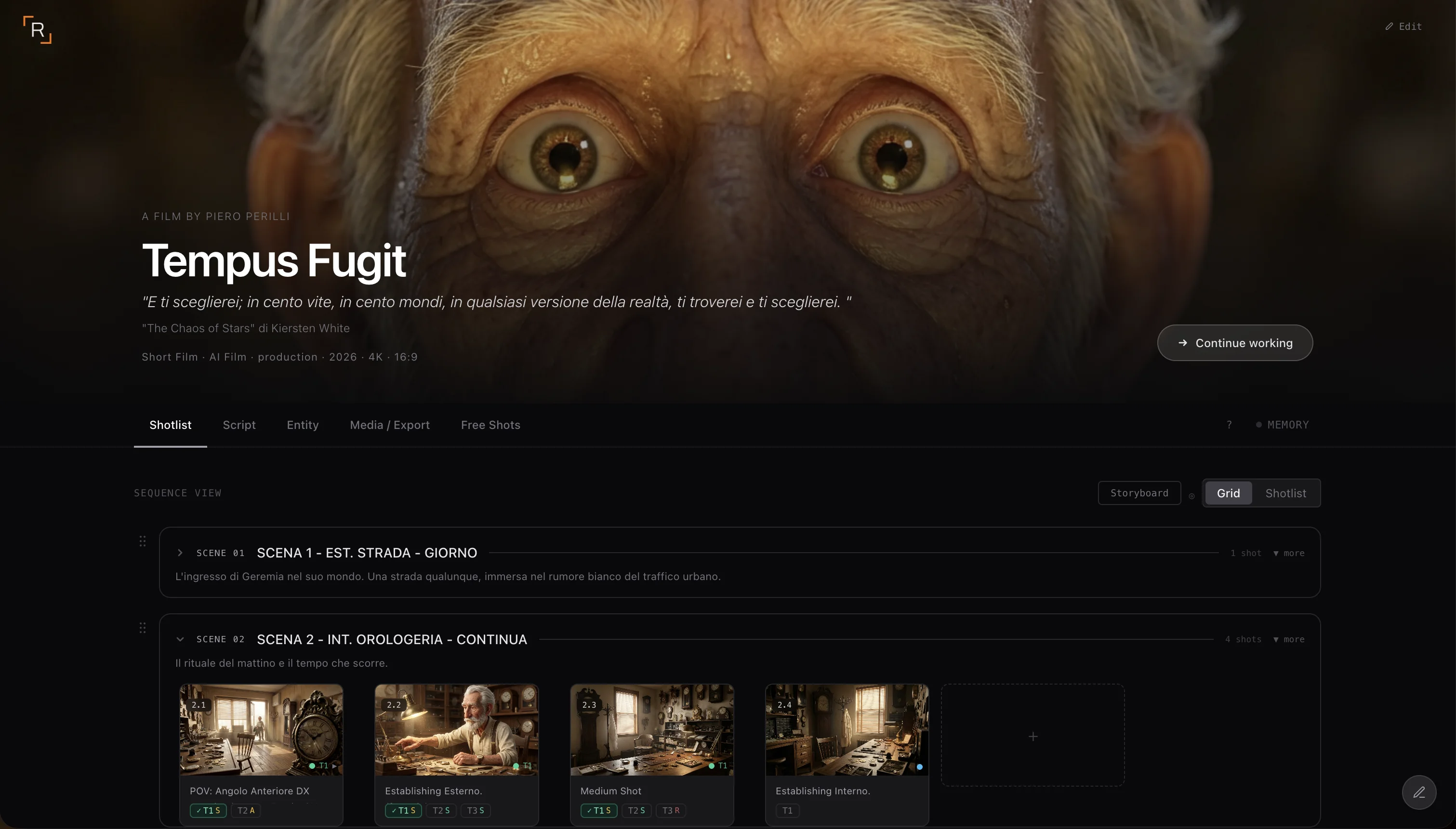 - Struttura gerarchica prima di generare. Definisci le scene e gli shot del progetto prima di aprire qualsiasi tool. Scena 01, Scena 02 — con una descrizione breve per ognuna. Ogni shot ha un numero (1.1, 1.2, 2.1) e un'intenzione visiva chiara.