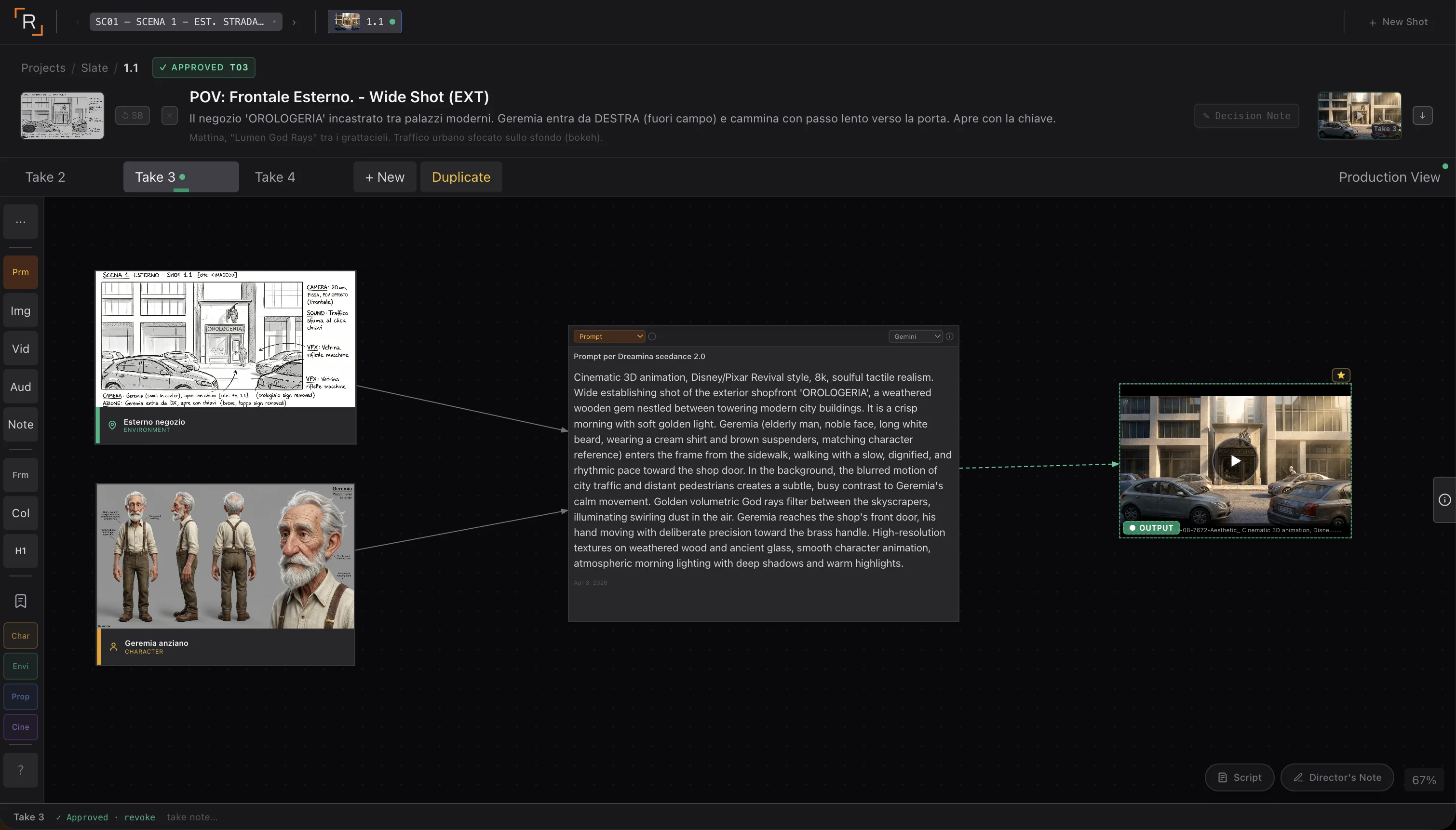 Quel prompt, quella reference del character sheet, quella nota — sono dentro il take 3, dentro lo shot 2.1, dentro la Scena 2. Tra un mese, quando dovrò generare varianti, il contesto è lì. Non da ricostruire.